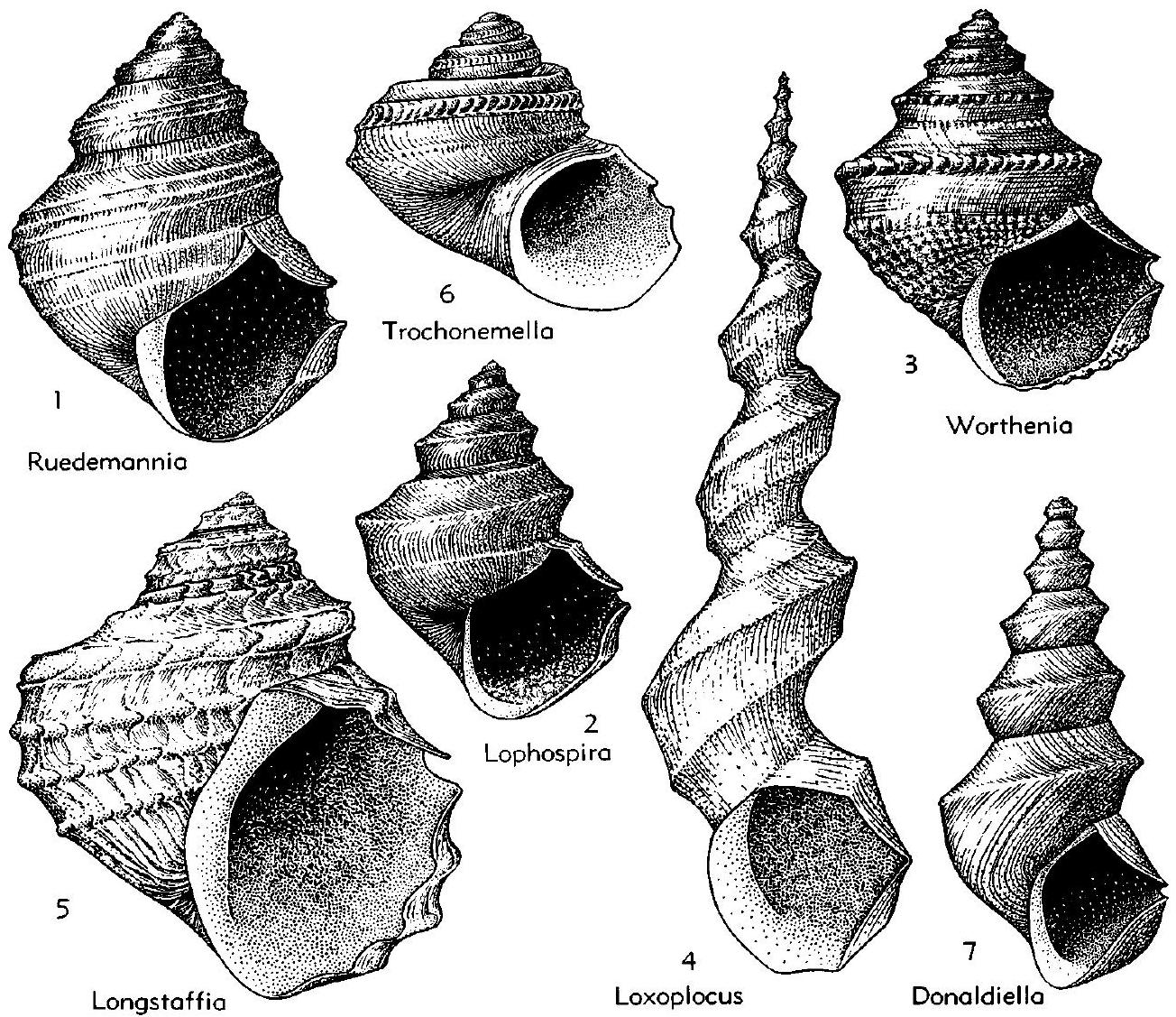 Shape like Loxoplocus (Lophospira) but highly ornamented with spiral and collabral threads, convex selenizone strongly crenulated, anomphalous or minutely phaneromphalous